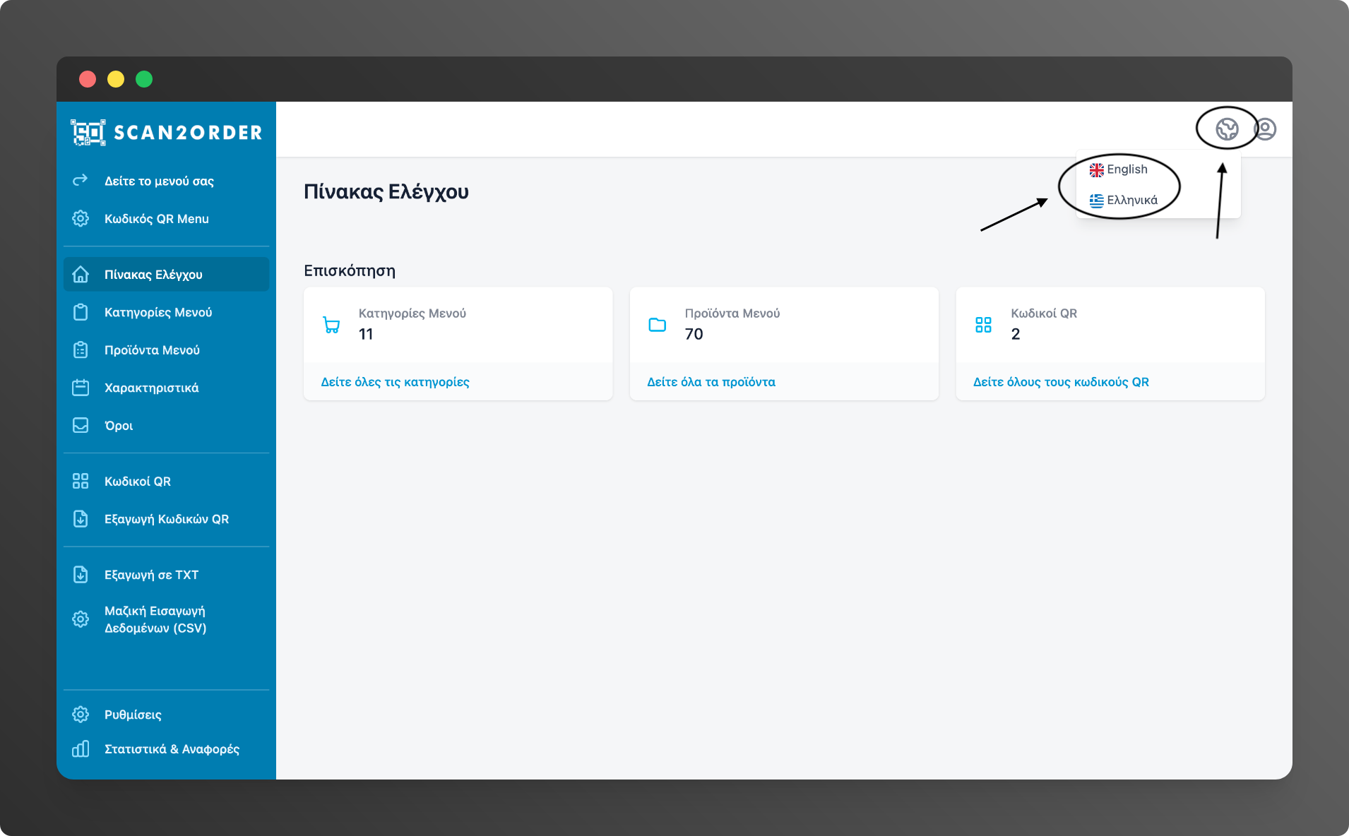 En haut à droite de votre écran se trouvent deux icônes. Cliquez sur l’icône de gauche et sélectionnez la langue que vous souhaitez utiliser pour votre tableau de bord.