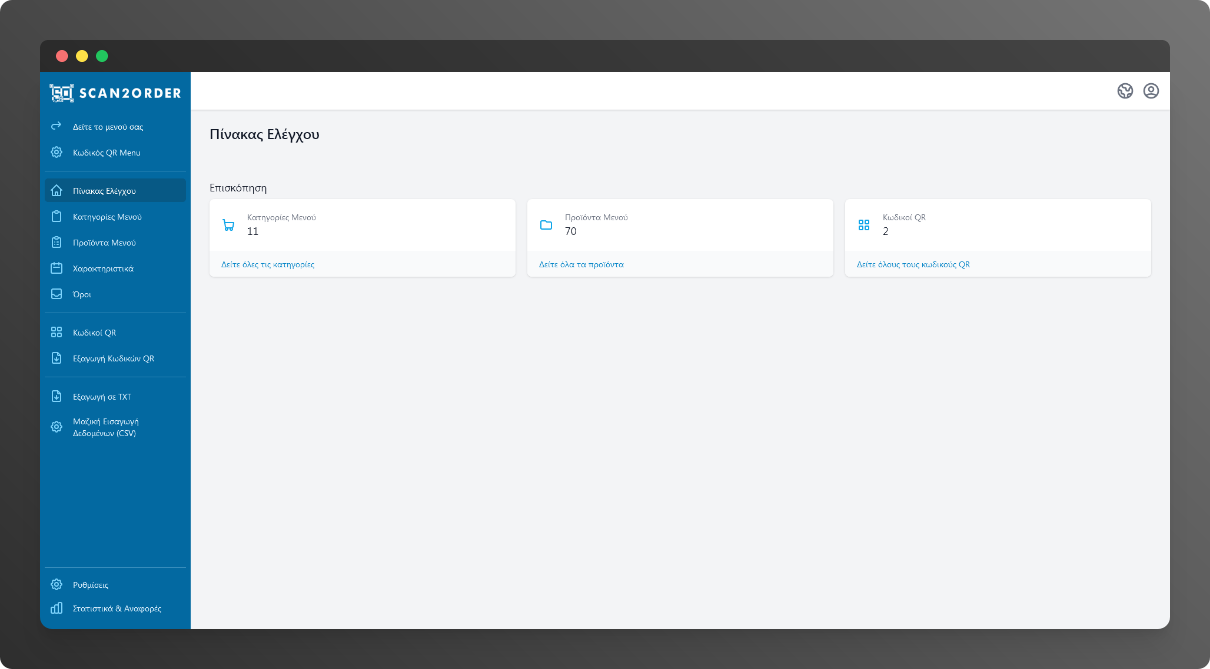 Στο κεντρικό μέρος της οθόνης (2) εμφανίζονται μια σειρά από στατιστικά που αφορούν την τρέχουσα κατάσταση του μενού σας. Πιο συγκεκριμένα μπορείτε να δείτε με μια ματιά τον συνολικό αριθμό κατηγοριών, των συνολικό αριθμό προϊόντων, καθώς και τον συνολικό αριθμό των τραπεζκωδικών QR σας.