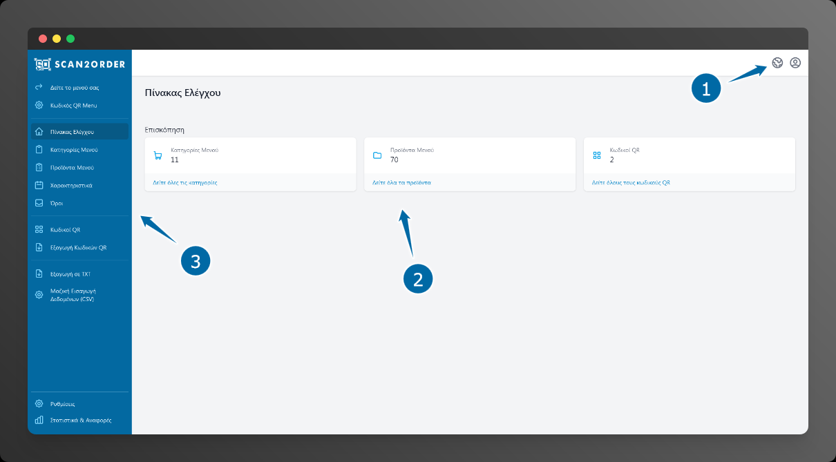 Στο κεντρικό μέρος της οθόνης (2) εμφανίζονται μια σειρά από στατιστικά που αφορούν την τρέχουσα κατάσταση του μενού σας. Πιο συγκεκριμένα μπορείτε να δείτε με μια ματιά τον συνολικό αριθμό κατηγοριών, των συνολικό αριθμό προϊόντων, καθώς και τον συνολικό αριθμό των κωδικών QR σας.
